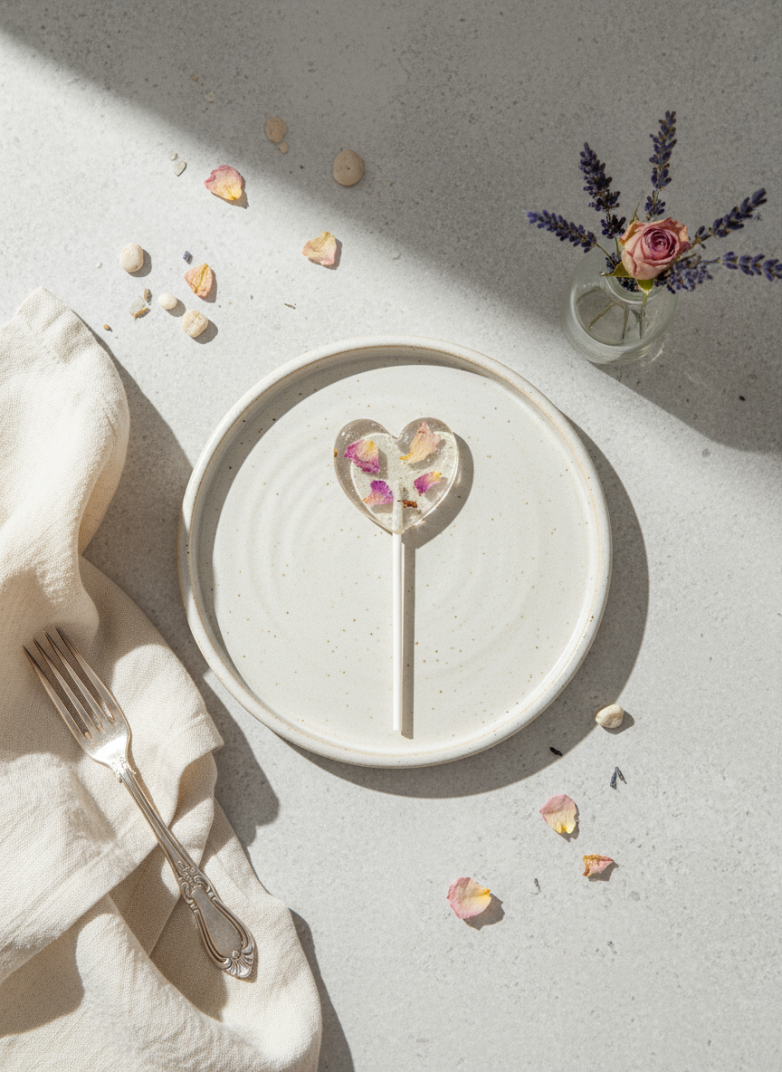 Jeder Lolli ist ein handgefertigtes Einzelstück – perfekt als liebevolles Gastgeschenk, für den Candy Table oder als zarte Aufmerksamkeit für besondere Menschen. Die Kombination aus natürlichen Blüten und edlem Gold macht ihn zu einem echten Blickfang, der Herz und Sinne berührt.